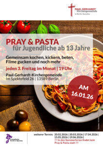 weiterer Termin: 20.02.2026 | 20.03.2026 | 17.04.2026 | 15.05.2026 | 19.06.2026 | !!! In den Sommerferien findet kein Pray & Pasta statt !!!